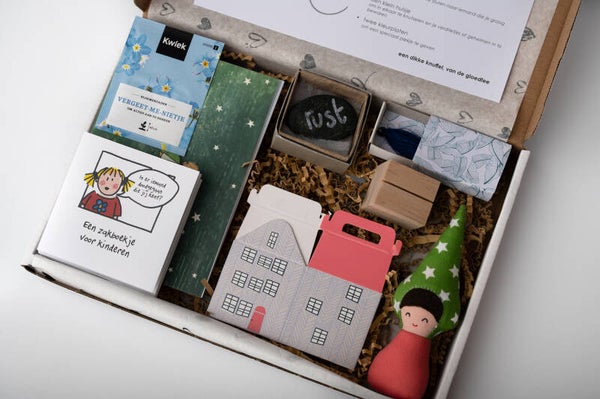 Deze troostpost-doos past door elke brievenbus. Je schenkt ermee: 2 kleurplaten, een tranenveger, een trooststeen, een lichtpuntmutsje, een huisje om verdrietjes of geheimpjes in te verstoppen, een boekje over rouw en verdriet, zaadjes vegeet-me-nietjes en een kaartje met kaarthoudertje. Allemaal leuk om te geven en zo troostend om te krijgen.