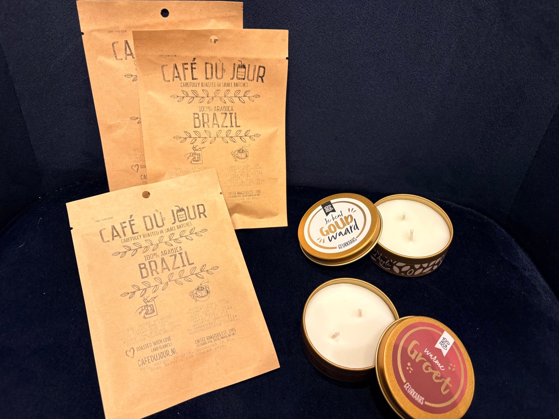 Gouden doos met 3 heerlijke slow koffie's 100% arabica en 2 geurkaarsen 'Je bent goud waard' en 'Warme groet'. Om je hart en ziel te verwarmen
